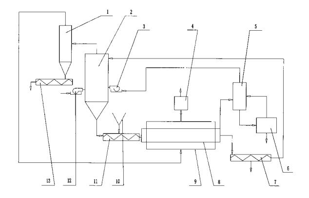1、流化床熱脫附設(shè)備包括熱脫附裝置、尾氣處理器(4)、篩分機(jī)(7)、急冷塔(5)、油水分離器(6)、旋風(fēng)除塵器(1)、出渣機(jī)(13)、用于盛裝砂子的流化床(2)以及用于對(duì)流化床(2)內(nèi)的砂子進(jìn)行加熱的第一燃燒器(12)和第二燃燒器(3),所述熱脫附裝置包括熱解吸室(8)和煙氣夾套(9),所述熱解吸室(8)的進(jìn)料口與流化床(2)的出砂口連接相通,熱解吸室(8)的進(jìn)料口同時(shí)還與污染土壤的進(jìn)料斗(10)連接相通,所述熱解吸室(8)的出料口與篩分機(jī)(7)的進(jìn)料口連接相通,熱解吸室(8)的出氣口與急冷塔(5)的進(jìn)氣口連接相通,所述篩分機(jī)(7)的出砂口與流化床的進(jìn)砂口連接相通,所述急冷塔(5)的出氣口與第二燃燒器(3)的燃?xì)膺M(jìn)口連接相通,所述急冷塔(5 )的出水口與油水分離器(6)的進(jìn)水口連接相通,所述油水分離器(6)的出水口與急冷塔(5)的進(jìn)水口連接相通,所述流化床(2)的出煙氣口與旋風(fēng)除塵器(1)的進(jìn)氣口連接相通,所述旋風(fēng)除塵器(1)的出煙氣口與熱解吸室(8)和煙氣夾套(9)所圍內(nèi)腔連接相通,所述尾氣處理器(4)的進(jìn)氣口也與該內(nèi)腔連接相通,所述出渣機(jī)(13)的進(jìn)料口與旋風(fēng)除塵器(1)的出塵口連接相通。