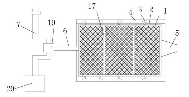 圖中:篩網(wǎng)框架1、過濾篩2、滾輪3,滾輪3、機(jī)架4、出口5、雜物傳輸帶11、連桿6、曲軸7、土壤淋洗設(shè)備、集料斗9、泥水分離設(shè)備8