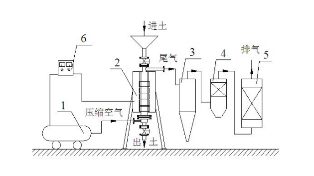 一種熱解吸系統(tǒng),其特征在于 :由立式解吸爐和空氣壓縮機(jī)組成,立式解吸爐為圓筒狀設(shè)備,外壁設(shè)置電加熱元件。污染土壤由進(jìn)料斗加入,通過(guò)電加熱元件間接加熱土壤至足夠溫度,使得污染土壤中揮發(fā)性 / 半揮發(fā)性有機(jī)物揮發(fā)出來(lái),同時(shí)空氣經(jīng)空氣壓縮機(jī)壓縮后由底部進(jìn)入立式解吸爐與污染土壤混合接觸,揮發(fā)出來(lái)的污染氣體在壓縮空氣的作用下快速帶出熱解吸系統(tǒng)進(jìn)入尾氣處理系統(tǒng)。壓縮空氣流量可以調(diào)節(jié),流量較小時(shí),解吸爐以立式固定床方式運(yùn)行,小的土壤顆粒不致被氣流帶走,可確保小的土壤顆粒在爐內(nèi)有足夠的停留(加熱)時(shí)間 ;流量較大時(shí),土壤顆粒在爐內(nèi)處于流化狀態(tài),解吸爐以流化床方式運(yùn)行,此時(shí),壓縮空氣可起到混合土壤的作用,并使土壤顆粒受熱均勻。