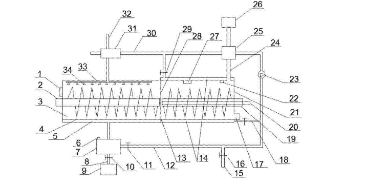 其主要工作原理是:污染土壤從修復(fù)箱的進(jìn)料口進(jìn)入噴淋修復(fù)后,同時啟動第一螺旋輸送機(jī)和噴淋裝置,外部的淋洗劑經(jīng)淋洗劑進(jìn)管進(jìn)入噴淋裝置并對污染土壤進(jìn)行淋洗,淋洗過程中,第一螺旋輸送機(jī)的旋轉(zhuǎn)軸轉(zhuǎn)動帶動螺旋葉片轉(zhuǎn)動,對污染土壤進(jìn)行攪拌,使淋洗劑和污染土壤混合均勻,修復(fù)徹底,同時,修復(fù)后的土壤在第一螺旋輸送機(jī)的作用下經(jīng)隔板下端的通孔進(jìn)入熱解吸修復(fù)室,而與污染土壤接觸并修復(fù)后的淋洗劑經(jīng)噴淋修復(fù)室底部的濾網(wǎng)進(jìn)入集液腔,然后經(jīng)淋洗劑冷管進(jìn)入第一換熱器,土壤進(jìn)入熱解吸修復(fù)室后,啟動土壤加熱裝置對土壤進(jìn)行加熱,第二螺旋輸送機(jī)的螺旋葉片轉(zhuǎn)動有利于土壤均勻受熱,受熱后的土壤中的有機(jī)物則從固相轉(zhuǎn)變成氣相,并經(jīng)廢氣管道排出,通過廢氣管道上的第一換熱器,將廢氣中的熱量傳遞給流經(jīng)第一換熱器的淋洗劑,加熱后的淋洗劑則經(jīng)淋洗劑熱管進(jìn)入第二換熱器,并